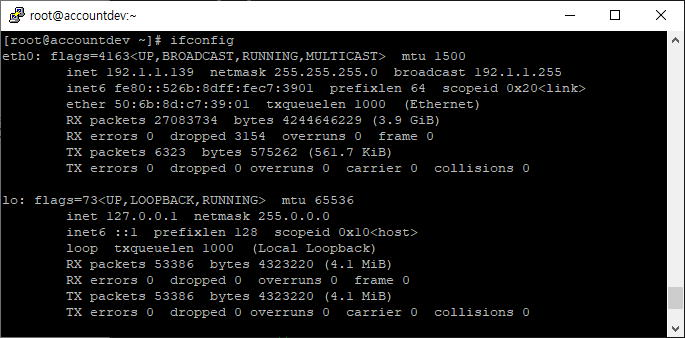 ifconfig 명령어 수행 시 위와 같은 설정된 네트워크 드라이버가 표기되며, 장비의 세부 정보가 나온다.