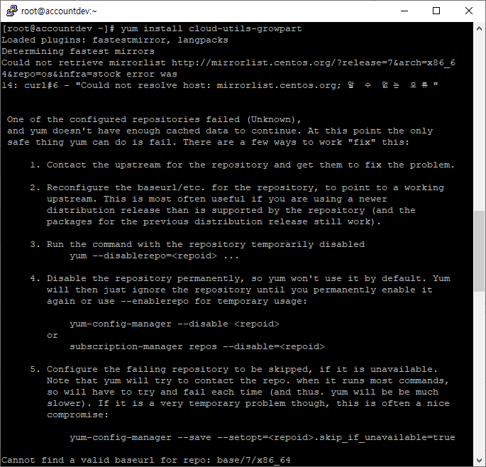 | Loaded plugins: fastestmirror, langpacks Determining fastest mirrors Could not retrieve mirrorlist http://mirrorlist.centos.org/?release=7&arch=x86_64&repo=os&infra=stock error was 14: curl#6 - "Could not resolve host: mirrorlist.centos.org; 알 수 없는 오류" ...(중략) |