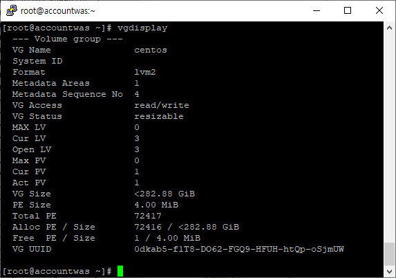 명령어 수행시 위와 같이 현재 총 볼륨그룹 (VG)의 총 사이즈 , 할당 사이즈, 여유 사이즈 등을 확인 할 수 있다.