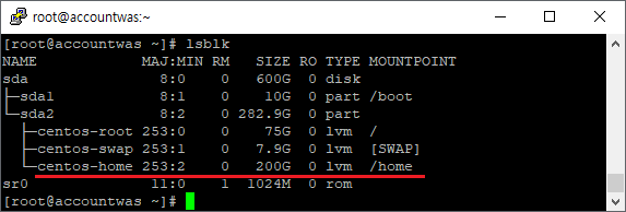 현재 확장하고자 하는 /home 디렉토리는 용량은 sda2의 centos-home 공간으로 배정된 것을 확인 할 수 있다.