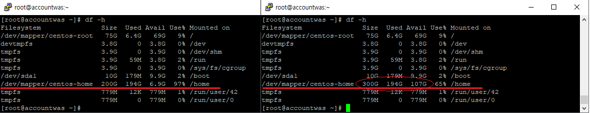 두 명령을 수행 하고 나면 증설 할당된 용량을 확인 할 수 있다. 옵션을 통해 300기가중 100기가만 배정 하였다.