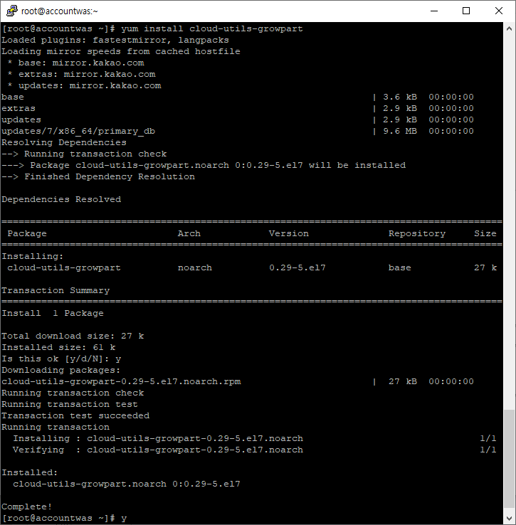 리눅스 용량 할당을 간편하게 도와주는 growpart 를 설치하여 진행해 보겠다. 해당 growpart는 기본 설치된 도구가 아니므로, yum을 통해 먼저 설치 가 필요하다.